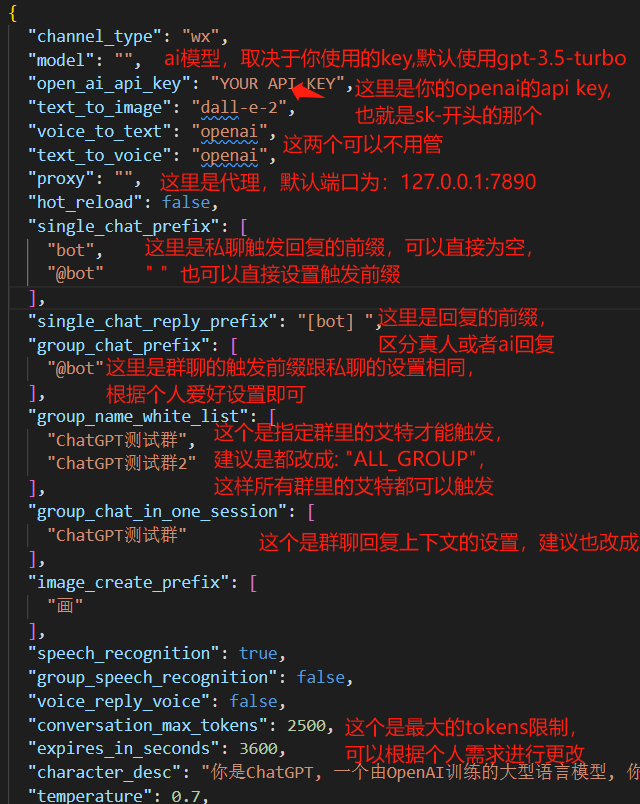 关于OpenAI对话及图片接口的参数配置(内容自由度、回复字数限制、图片大小等),可以参考 对话接口 和 图像接口 文档,在config.py中检查哪些参数在本项目中是可配置的。conversation_max_tokens:表示能够记忆的上下文最大字数(一问一答为一组对话,如果累积的对话字数超出限制,就会优先移除最早的一组对话)rate_limit_chatgpt,rate_limit_dalle:每分钟最高问答速率、画图速率,超速后排队按序处理。clear_memory_commands: 对话内指令,主动清空前文记忆,字符串数组可自定义指令别名。hot_reload: 程序退出后,暂存微信扫码状态,默认关闭。character_desc 配置中保存着你对机器人说的一段话,他会记住这段话并作为他的设定,你可以为他定制任何人格 (关于会话上下文的更多内容参考该 issue)subscribe_msg:订阅消息,公众号和企业微信channel中请填写,当被订阅时会自动回复, 可使用特殊占位符。目前支持的占位符有{trigger_prefix},在程序中它会自动替换成bot的触发词。