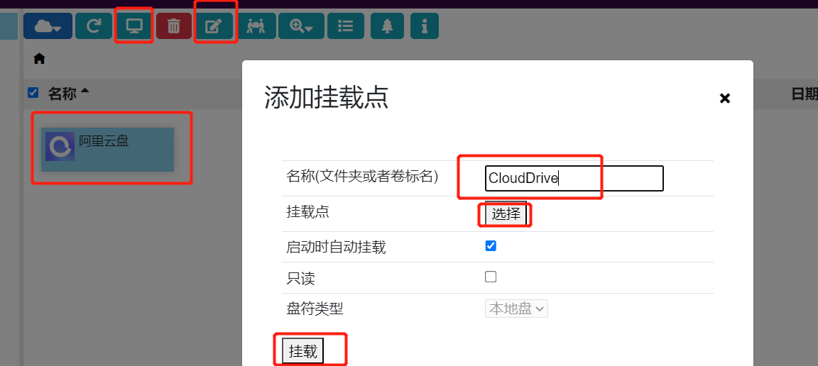 登录后我们要先选中新建好的盘符,可以更改自己喜欢的名称,然后会出现配置挂载选项,挂载点选择一个你电脑没有的,博主选的G盘,默认是启动时自动挂载,然后点击挂载