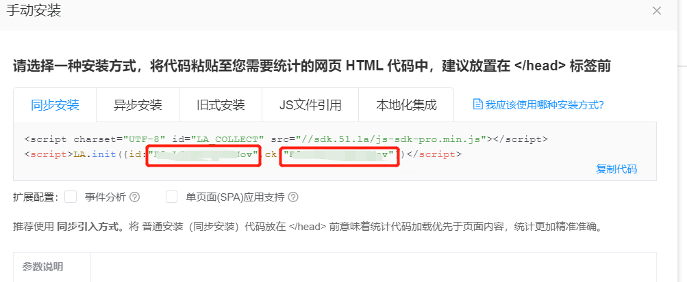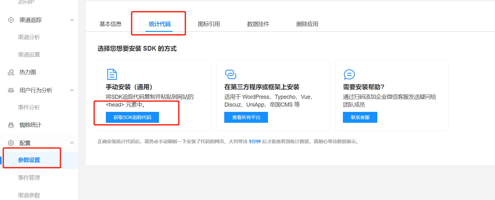 接下来就是如何配置了,首先我们点击参数设置–>统计代码–>手动安装