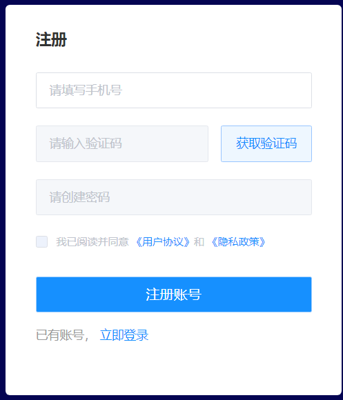 先别着急 我们先点击注册,直接填直接的手机号获取验证码,然后输入一个不能让别人知道的密码就可以开始我们的下一步了